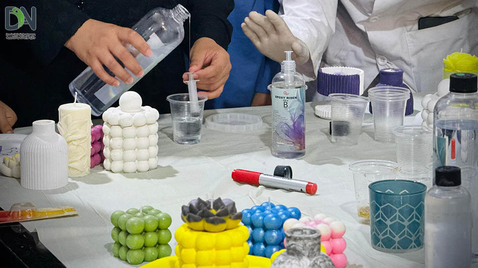 خلال فترة التدريب، يتم التركيز على تنمية مهارات استخدام الريزن والكونكريت نظراً لما تضفيه من جمالية وإبداع في مجال الصناعات اليدوية.