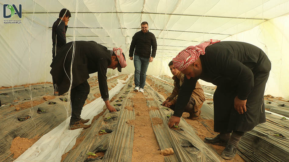 In response to these challenges, DAN Relief and Development launched a project aimed at strengthening the skills of agricultural cooperative members through the establishment of “Farmer Field Schools.” The project is being implemented in Yarmouk Farm (Khirbet Al‑Inab Cooperative) and Jarboua Village (Al‑Noor Cooperative), focusing on climate-smart agriculture techniques for vegetable production in protected environments.